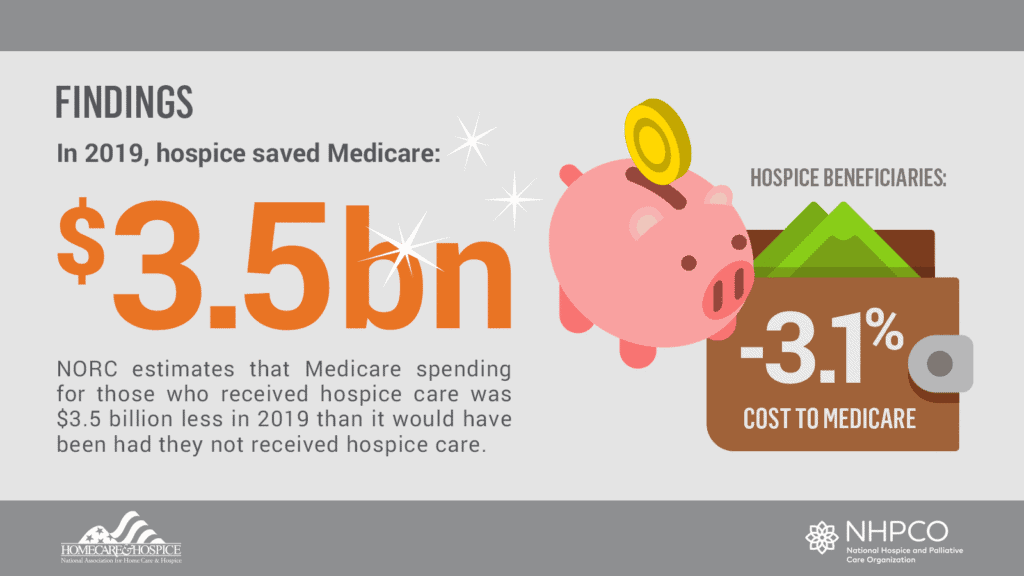 - NORC estimates that Medicare spending for those who received hospice care was $3.5 billion less than it would have been had they not received hospice care.
